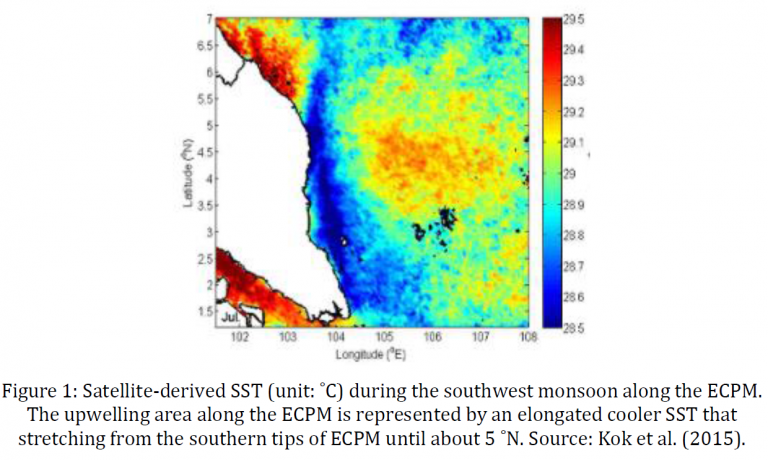 Upwelling is an oceanographic process that has a major impact on primary productivity as it replenishes nutrient-depleted surface water for phytoplankton growth. Although the upwelling has been extensively studied, but this is not the case for the smaller scale upwelling area located along east of Peninsular Malaysia (ECPM). The upwelling along the ECPM was only discovered in the 2010s, which is far behind other upwelling areas, so lots of important features are still ambiguous. Intensive studies should therefore be conducted in order to enhance current knowledge and to acquire new information on the upwelling process along the ECPM.