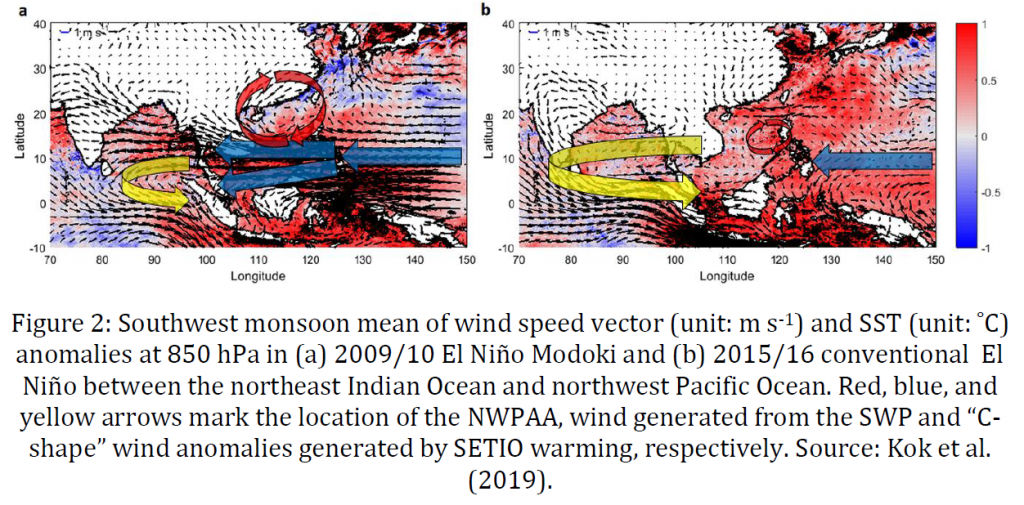 In addition, a study has been carried out to investigate the interannual variability of upwelling along the EPCM. The upwelling along the PMEC displayed interannual variability that is closely associated with the delayed El Niño Southern Oscillation (ENSO) effect. Our analysis focusing on the two El Niños varieties, i.e. 2009/10 El Niño and 2015/16 El Niño suggested that intense northwest Pacific anticyclone anomaly and the occurrence of the northerly wind anomalies from the subtropical western Pacific in 2010 weakened the upwelling along the ECPM. While in 2016, the existence of the “C-shape” wind anomalies generated by the warming of the southeast tropical Indian Ocean weakened the upwelling the upwelling along the ECPM (Kok et al., 2019) (Figure 2).